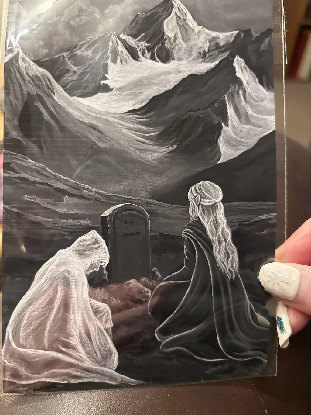 This painting explores the quiet persistence of love beyond loss. One figure kneels in mourning while the other remains, translucent yet present, bound not by the physical world but by memory, devotion, and unfinished love. The grave marks absence, but the tether between the souls show that some bonds endure beyond death, time, and silence.